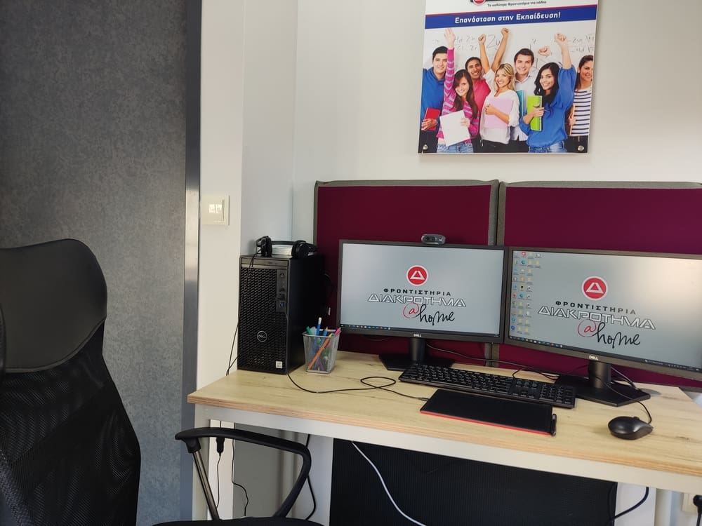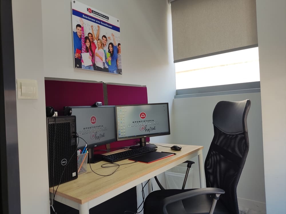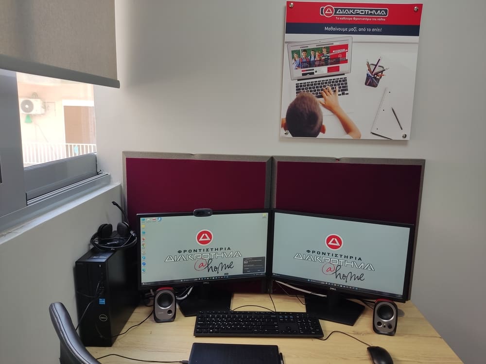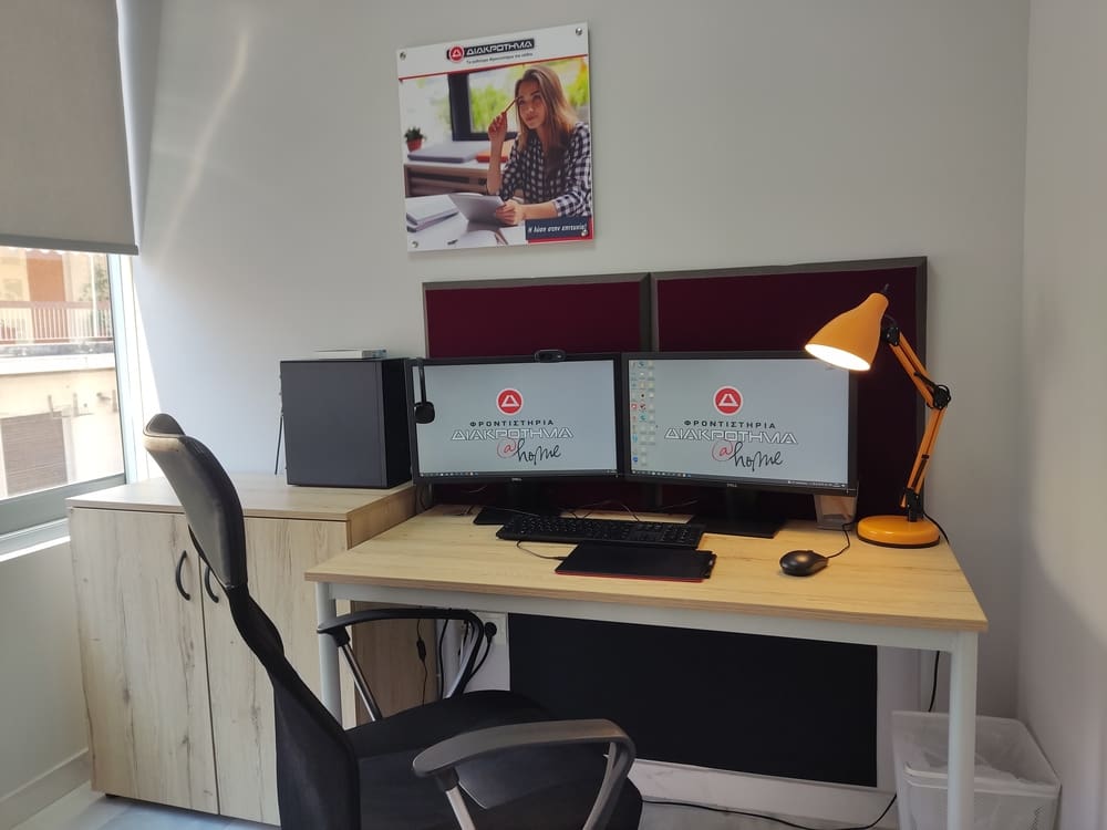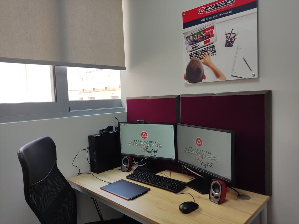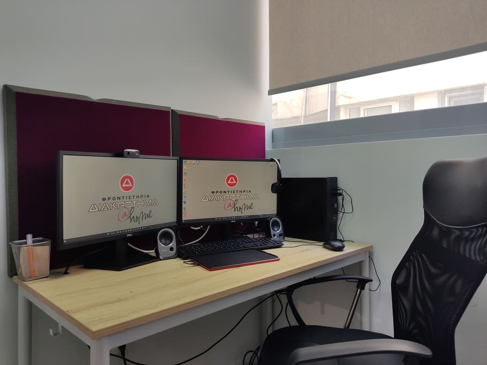 Το ΔΙΑΚΡΟΤΗΜΑ@HOME στεγάζεται σε έναν υπερσύγχρονο χώρο στο κέντρο του Πειραιά, ειδικά διαμορφωμένο για τις ανάγκες της διαδικτυακής διδασκαλίας. Οι καθηγητές μας διδάσκουν σε άνετες, τεχνολογικά εξοπλισμένες αίθουσες που εξασφαλίζουν υψηλής ποιότητας εκπαιδευτική εμπειρία για τους ίδιους και κυρίως για τους μαθητές μας. Οι εγκαταστάσεις περιλαμβάνουν: